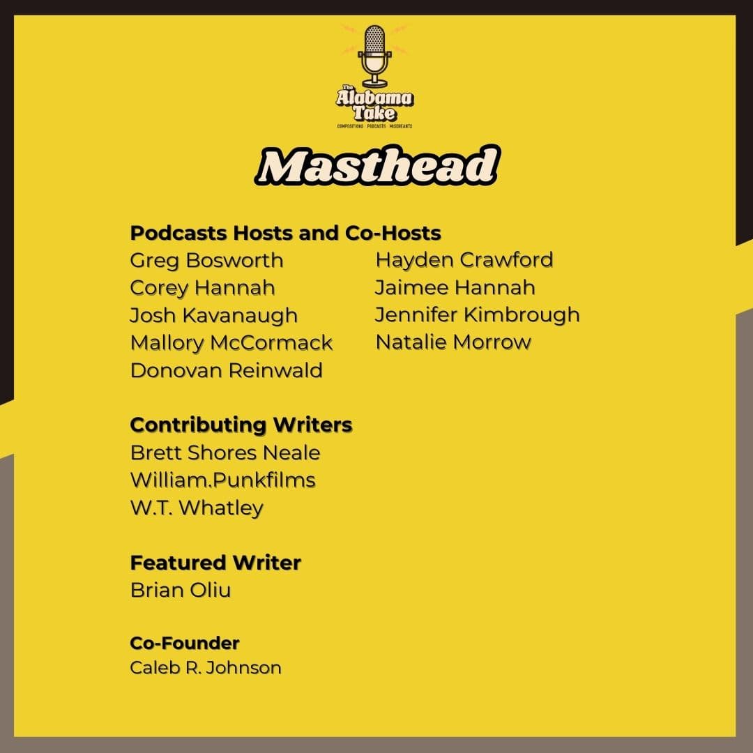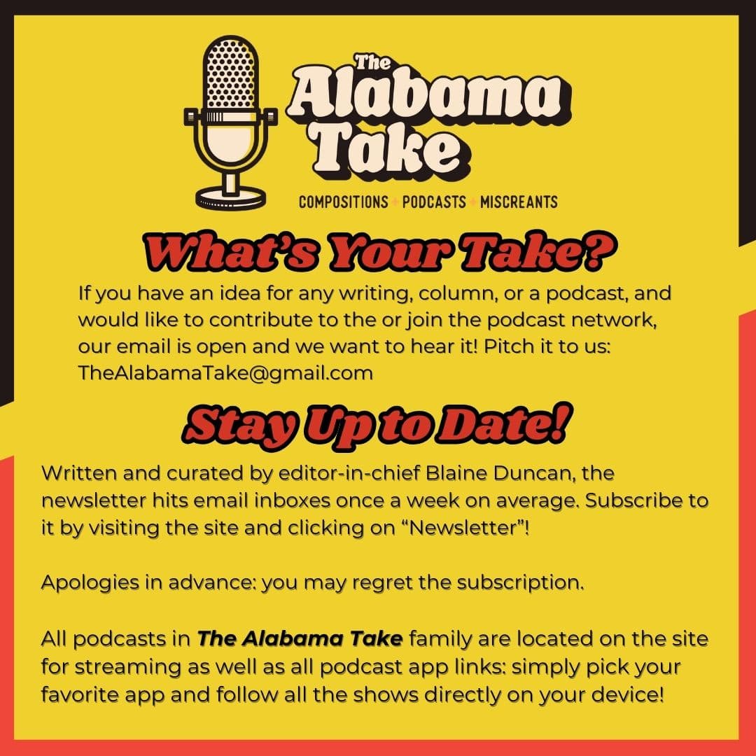 If you wish to join The Alabama Take and its family or have ideas and suggestions on what you want from the site, send an email or use the voice message or both the site and the array of podcasts!
